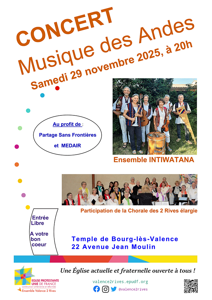 Le soir même nous aurons la joie d’écouter un concert de Musique des Andes, à 20 h, présenté par l’ensemble Intiwatana avec la participation de la chorale des 2 Rives « élargie ». La recette de cette soirée sera partagée au profit de Medair et de Partage Sans Frontières.