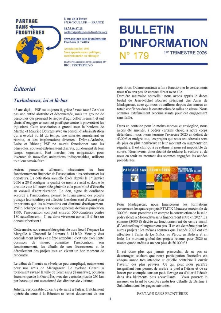 Le bulletin 179, du 1er trimestre 2026 Nous avons le plaisir de soumettre notre nouveau bulletin du 1er trimestre 2026 à votre sagacité de lectrices et de lecteurs. www.partage-sans-frontieres.org/pdf/bupsf179.pdf C’est le premier de l’année, donc très important pour nous. Vous y retrouverez des nouvelles des projets soutenus, en Bolivie, au Pérou, à Madagascar et en Inde. Vous y trouverez aussi l’annonce de nos prochaines manifestations : 8 mars 2026 : stand au salon Voyager autrement, salle des fêtes de Beaumont-lès-Valence, toute la journée. 14 mars 2026 : assemblée générale de Partage Sans Frontières de 14h30 à 16h à La Margelle,